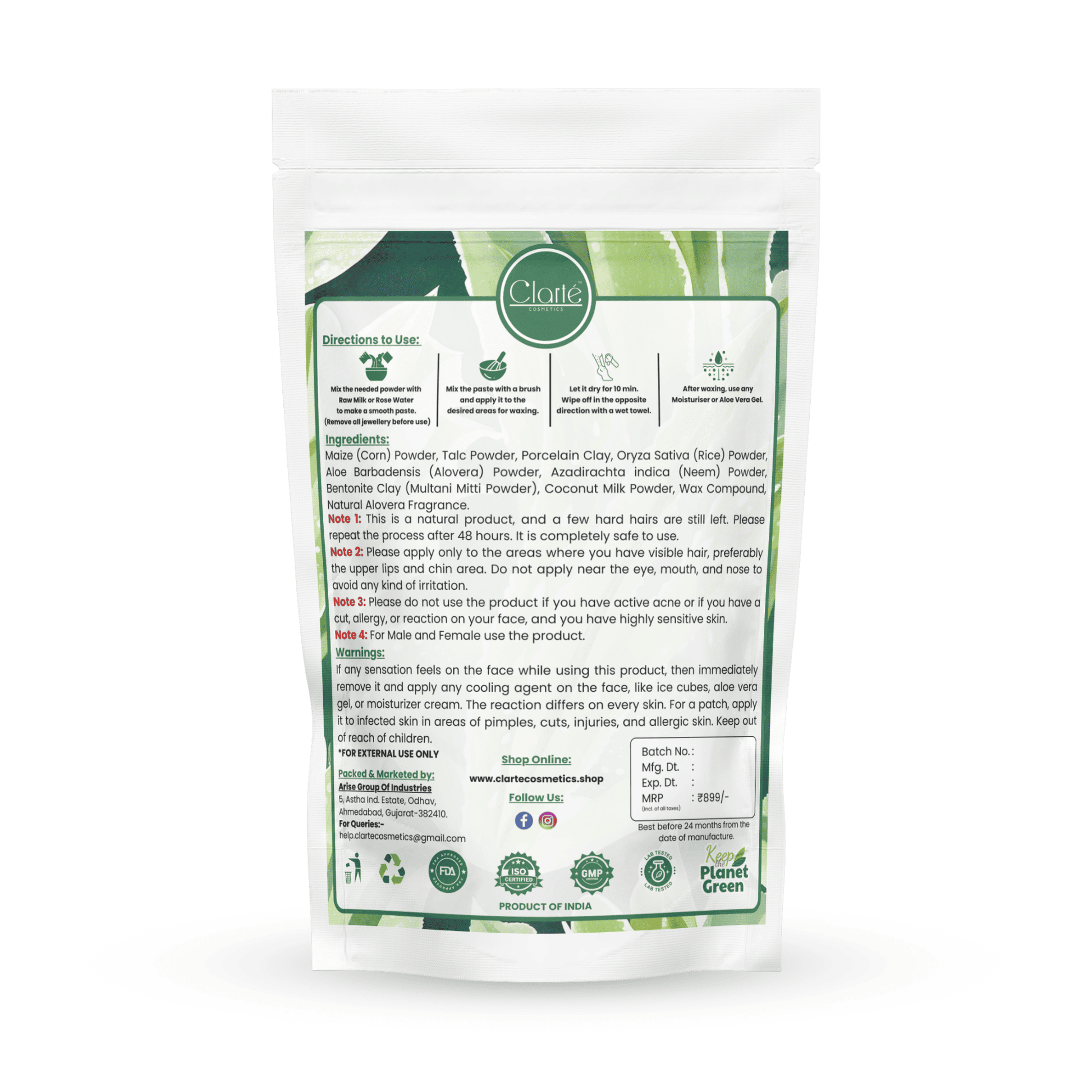 Maize (Corn) Powder, Talc Powder, Porcelain Clay, Oryza Sativa (Rice) Powder, Aloe Barbadensis (Alovera) Powder, Azadirachta indica (Neem) Powder, Bentonite Clay (Multani Mitti Powder), Coconut Milk Powder, Wax Compound, Natural Alovera Fragrance.